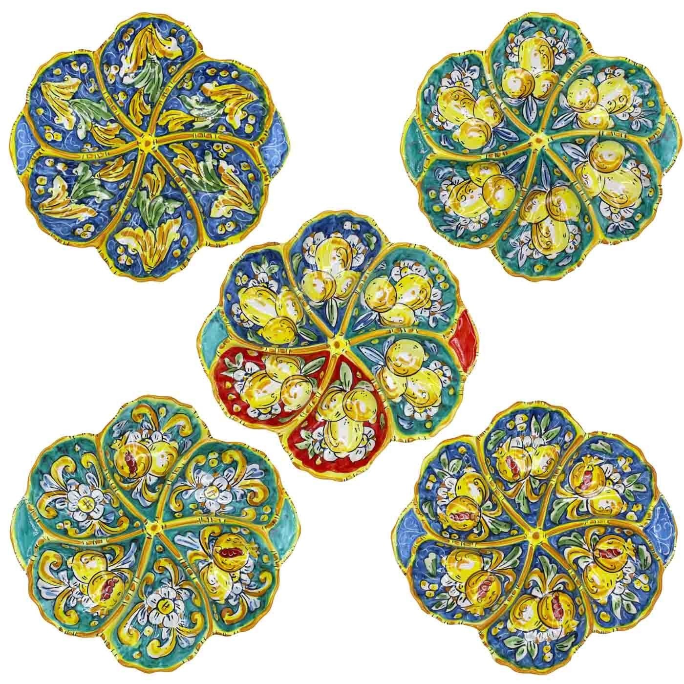 Vorspeisenteller in Muschelform mit sechs Fächern, aus feiner Caltagirone-Keramik, handgefertigt und dekoriert von unseren Handwerksmeistern.