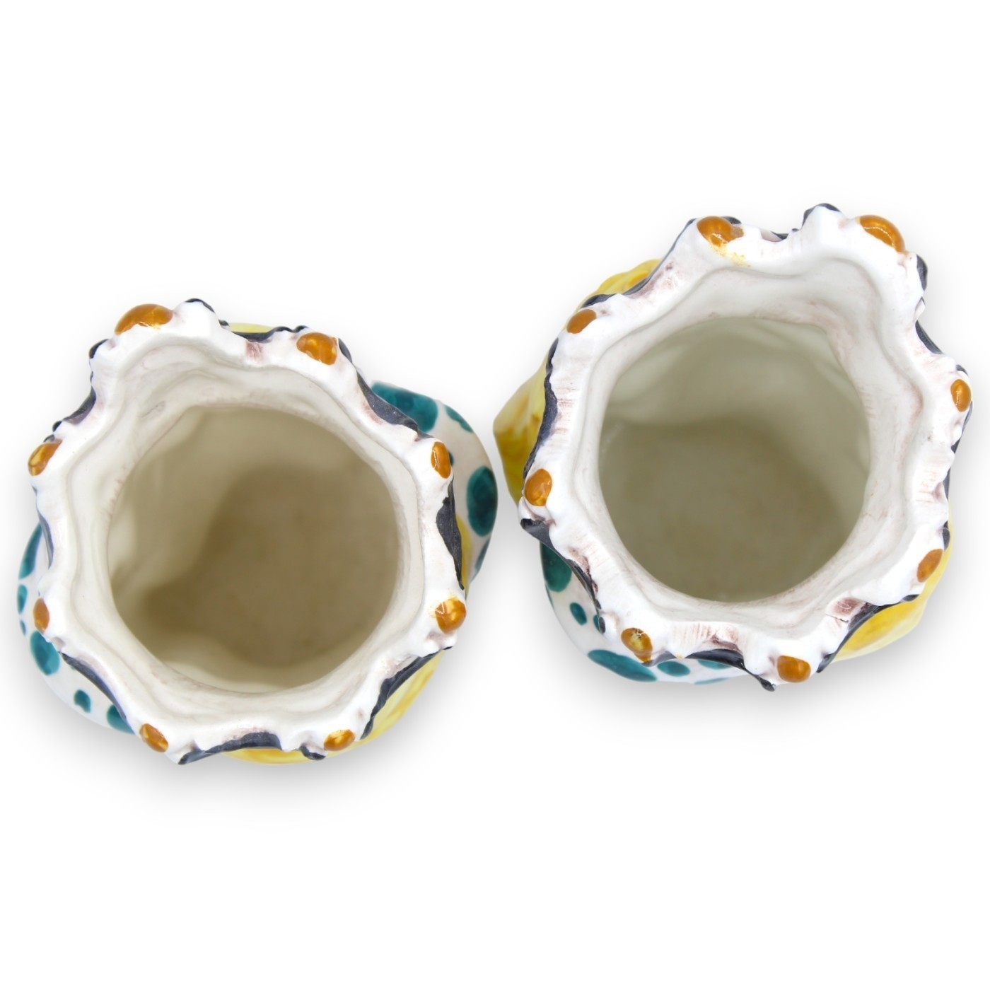 Sie wurden von einem Handwerksmeister aus Caltagirone handgefertigt, der sich um jedes einzelne Detail kümmerte, um daraus, wie auf den Fotos deutlich zu erkennen ist, ein wirklich einzigartiges Objekt der Calatina-Kunst zu machen.