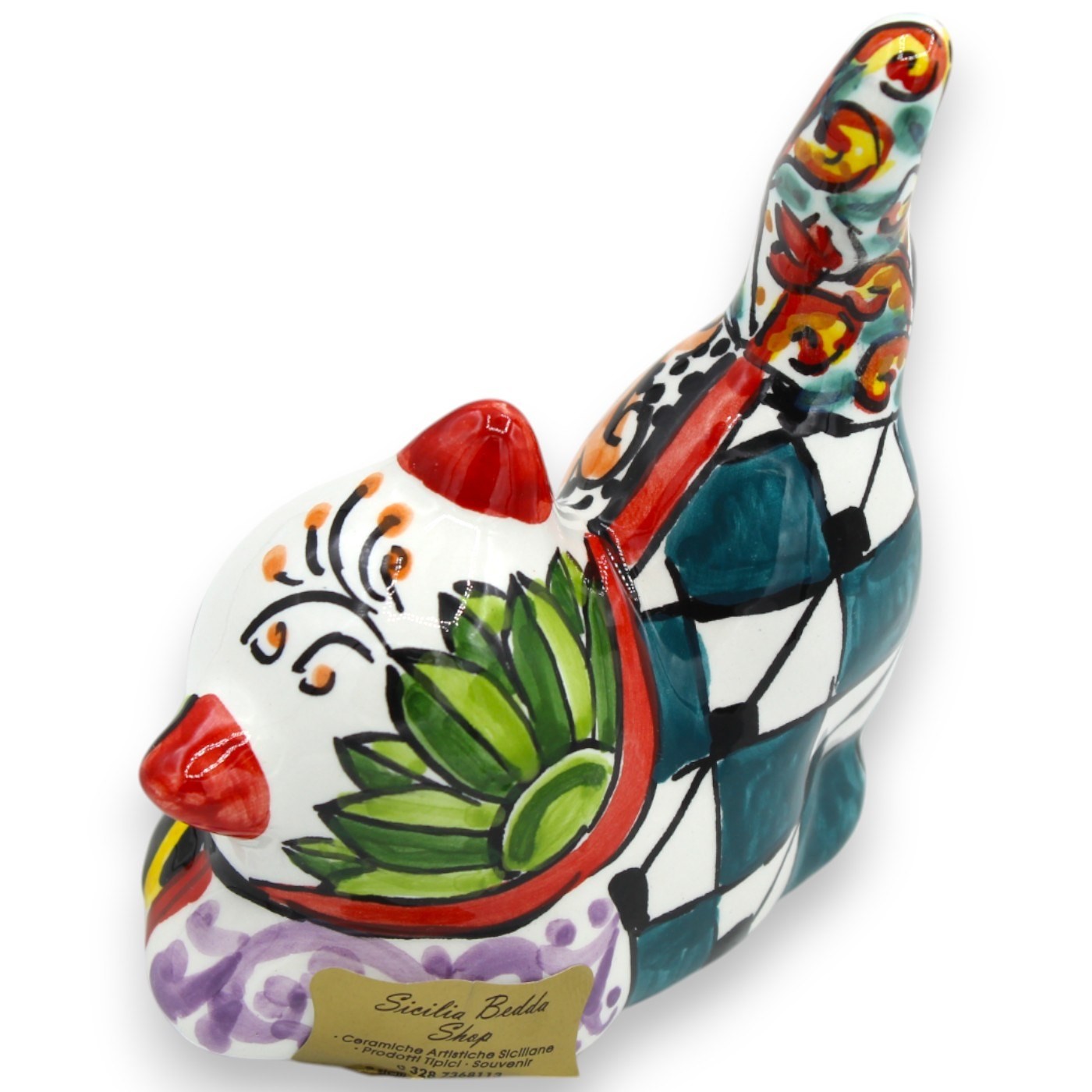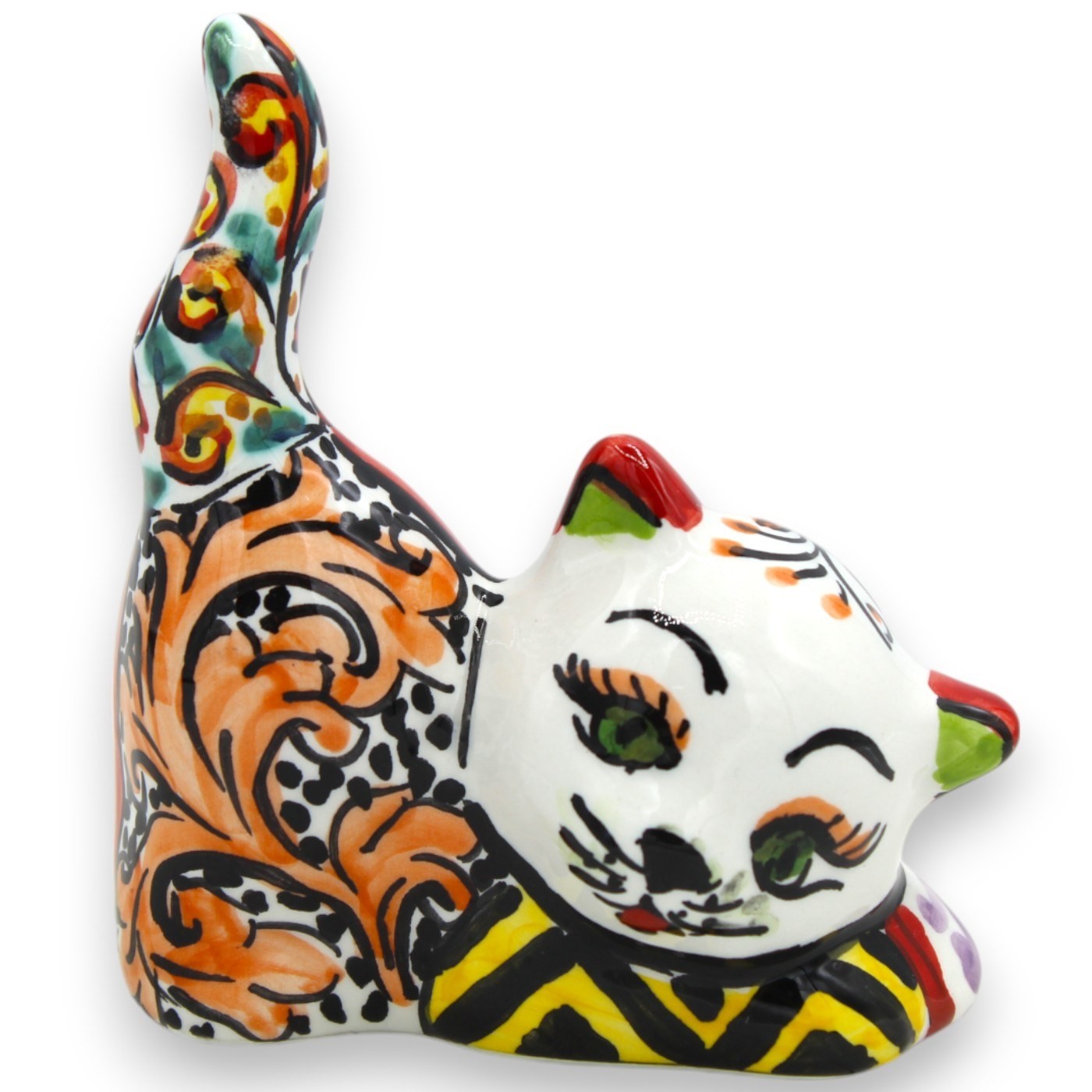 Prächtige Katze mit nach oben gerichtetem Schwanz aus feiner Caltagirone-Keramik, von unseren Handwerksmeistern sorgfältig von Hand gefertigt und dekoriert.