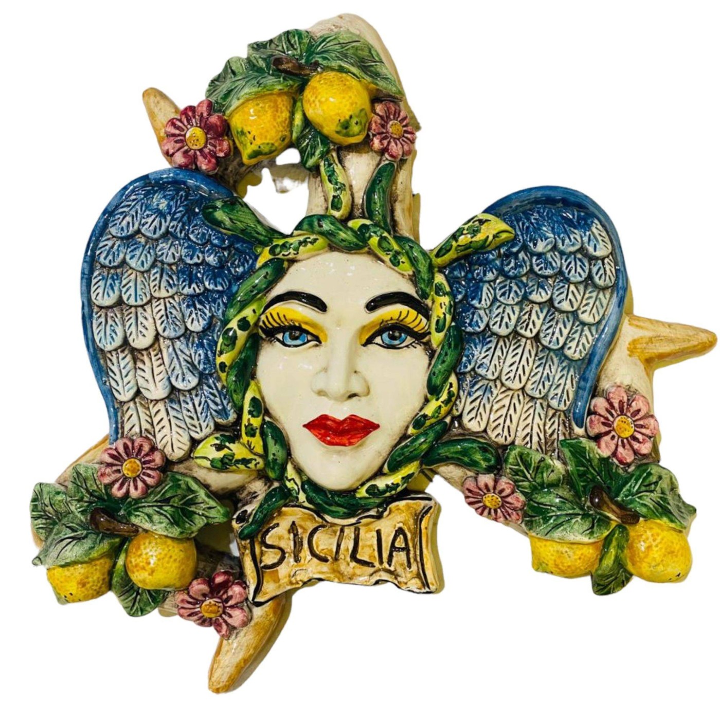 Große Trinacria aus sizilianischer Keramik mit Zitronen und Blumen, vollständig von Hand verziert