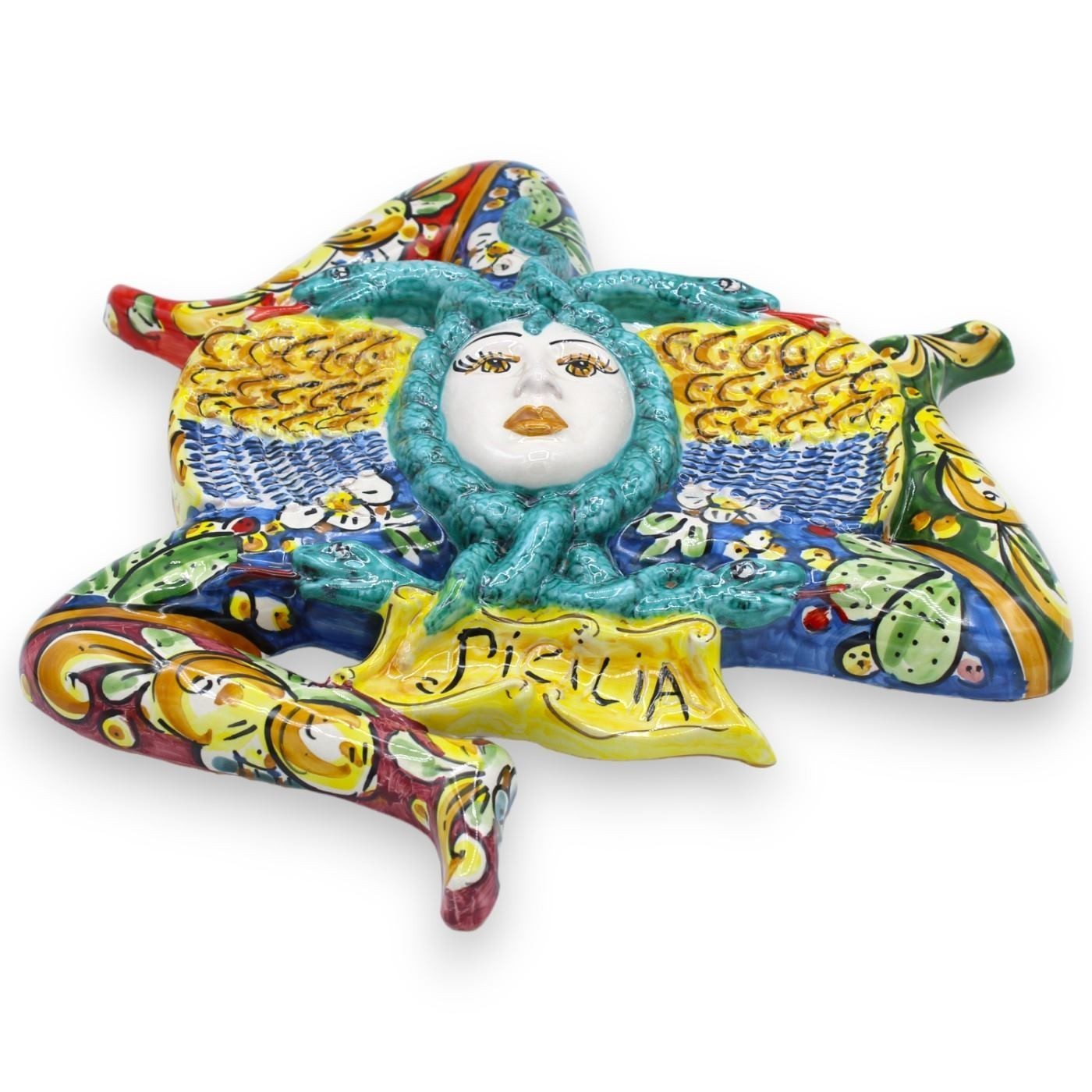 Atemberaubende Trinacria aus Caltagirone-Keramik, hergestellt und sorgfältig von Hand dekoriert von unseren Meisterhandwerkern.