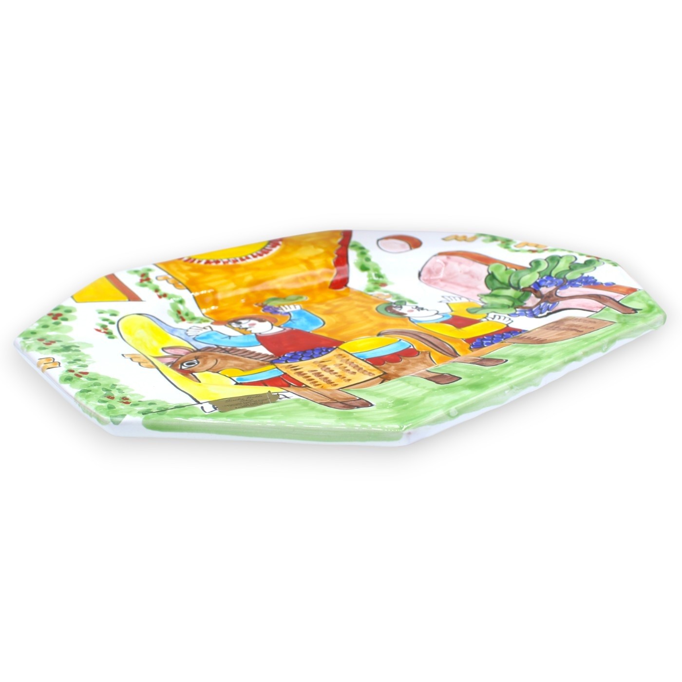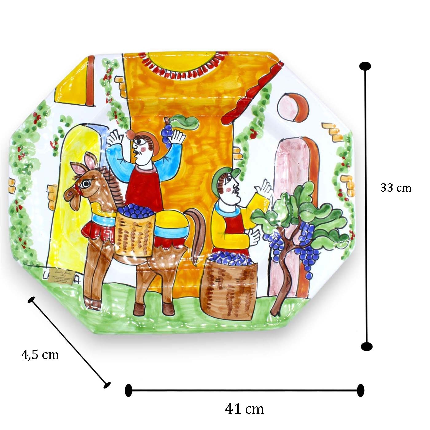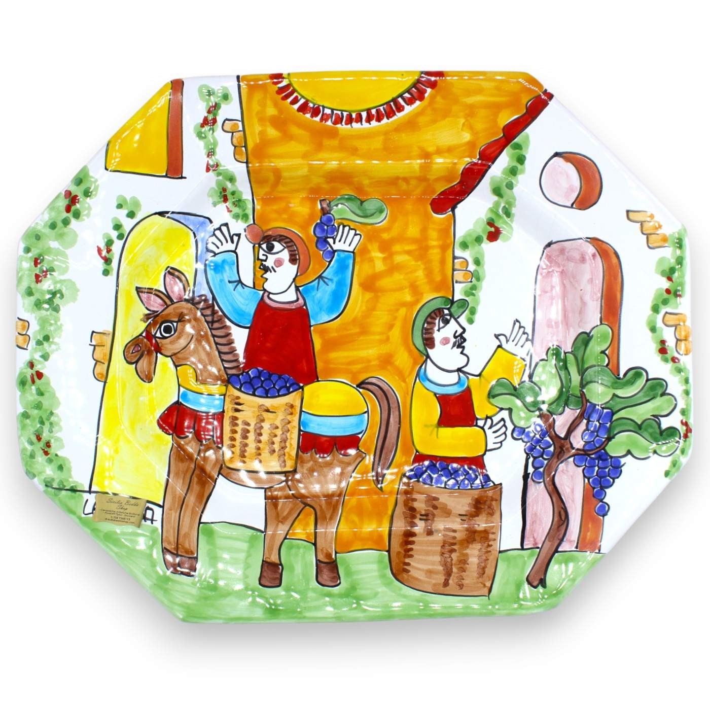Prächtiges achteckiges Tablett aus feiner sizilianischer Keramik , das eine stimmungsvolle Szene der Weinlese darstellt – ein Symbol für Tradition, Wohlstand und mediterrane Geselligkeit.
