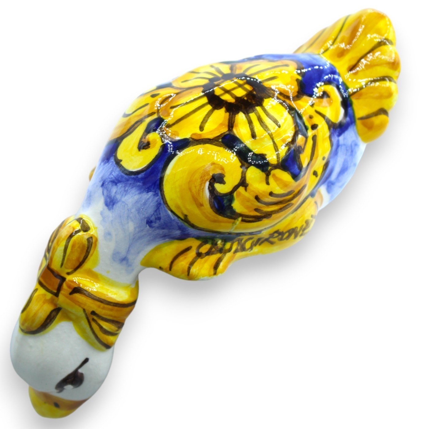Pato al revés (la curtigghiara), en cerámica de Caltagirone, realizado y minuciosamente decorado a mano por nuestros maestros artesanos.