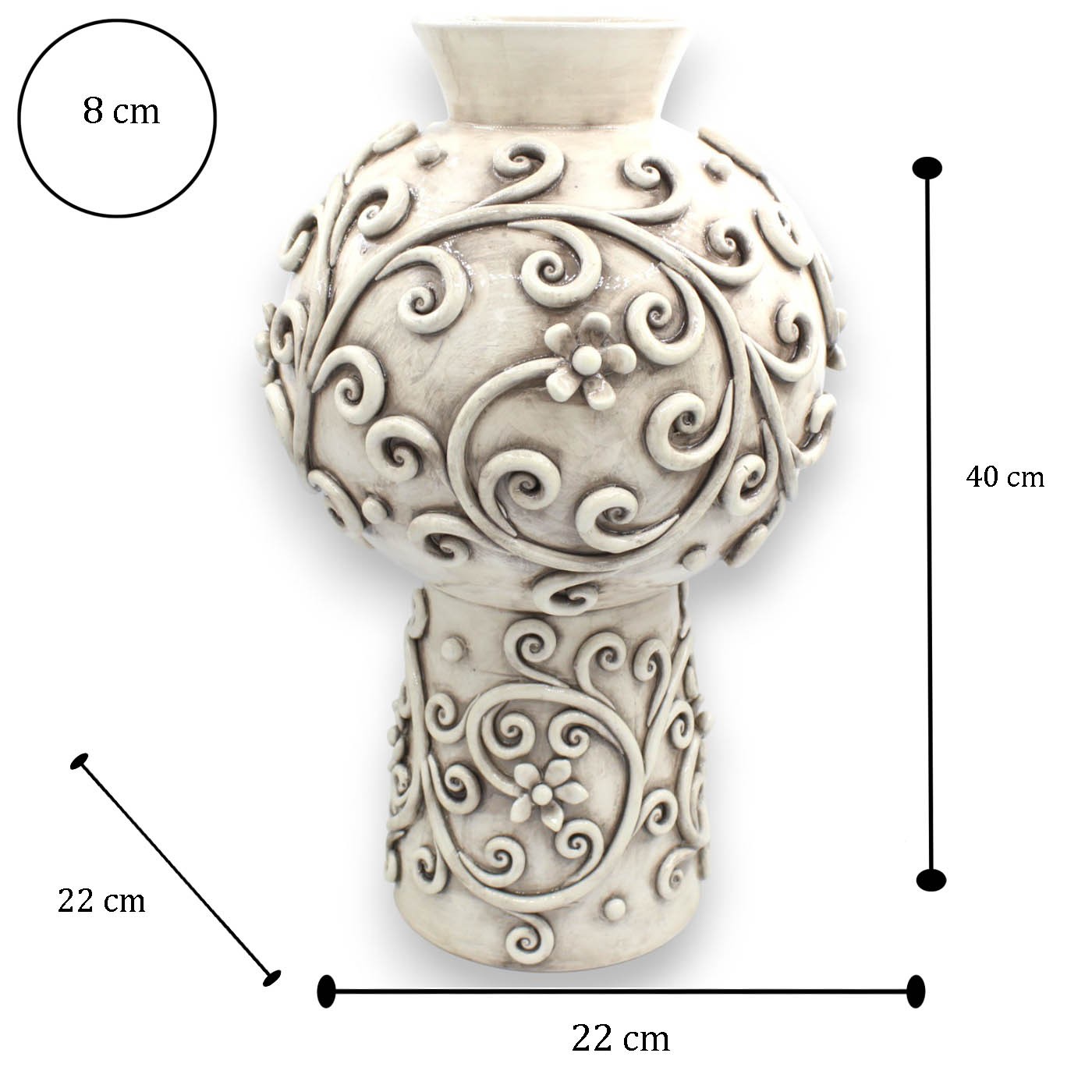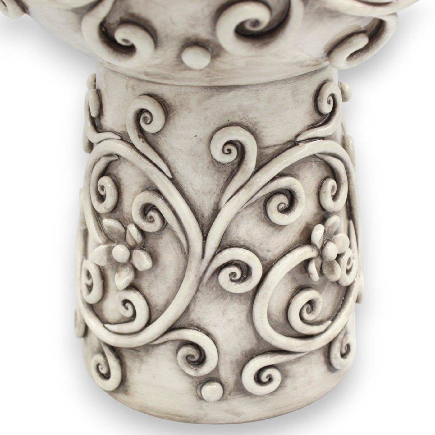 Elaborado íntegramente a mano por maestros artesanos de Caltagirone , este jarrón destaca por sus elegantes aplicaciones decorativas en relieve que envuelven toda la superficie , creando un refinado juego de espirales y motivos florales. El delicado acabado Bianco Antico aporta profundidad, brillo y un sofisticado efecto texturizado, ideal para ambientes modernos, rústicos y chic, o clásicos renovados.