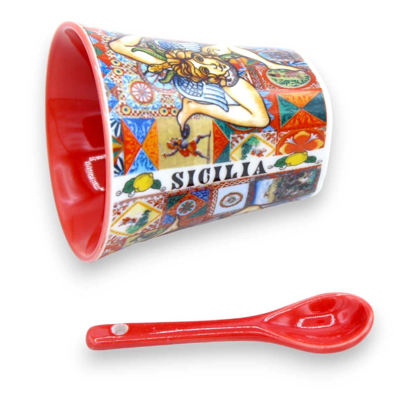 Taza de cerámica con cuchara con elementos temáticos de Sicilia, como trinacria, carro siciliano y mayólica siciliana.