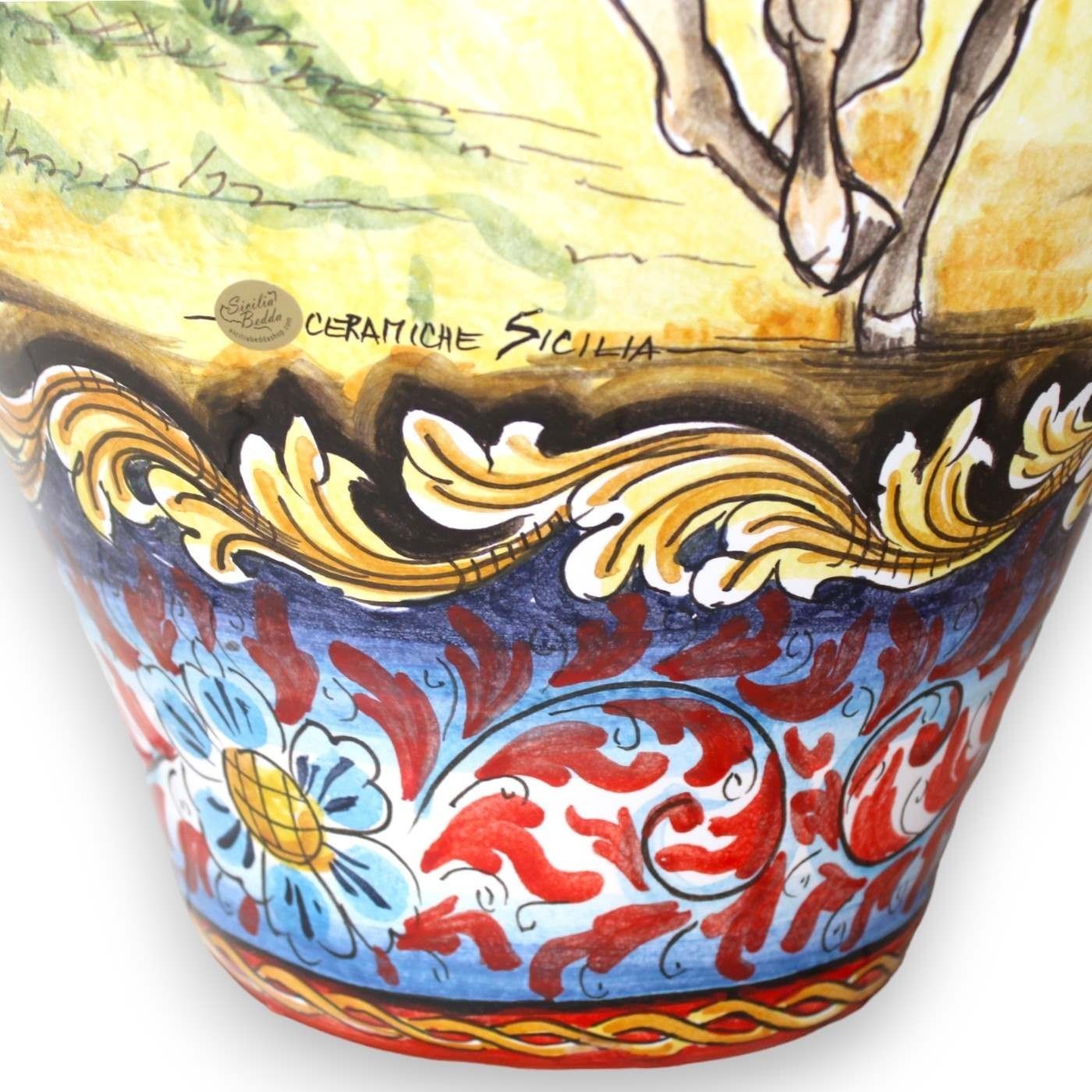 Espléndida jarra, de fina cerámica siciliana, realizada al torno por nuestros maestros artesanos y meticulosamente decorada a mano.