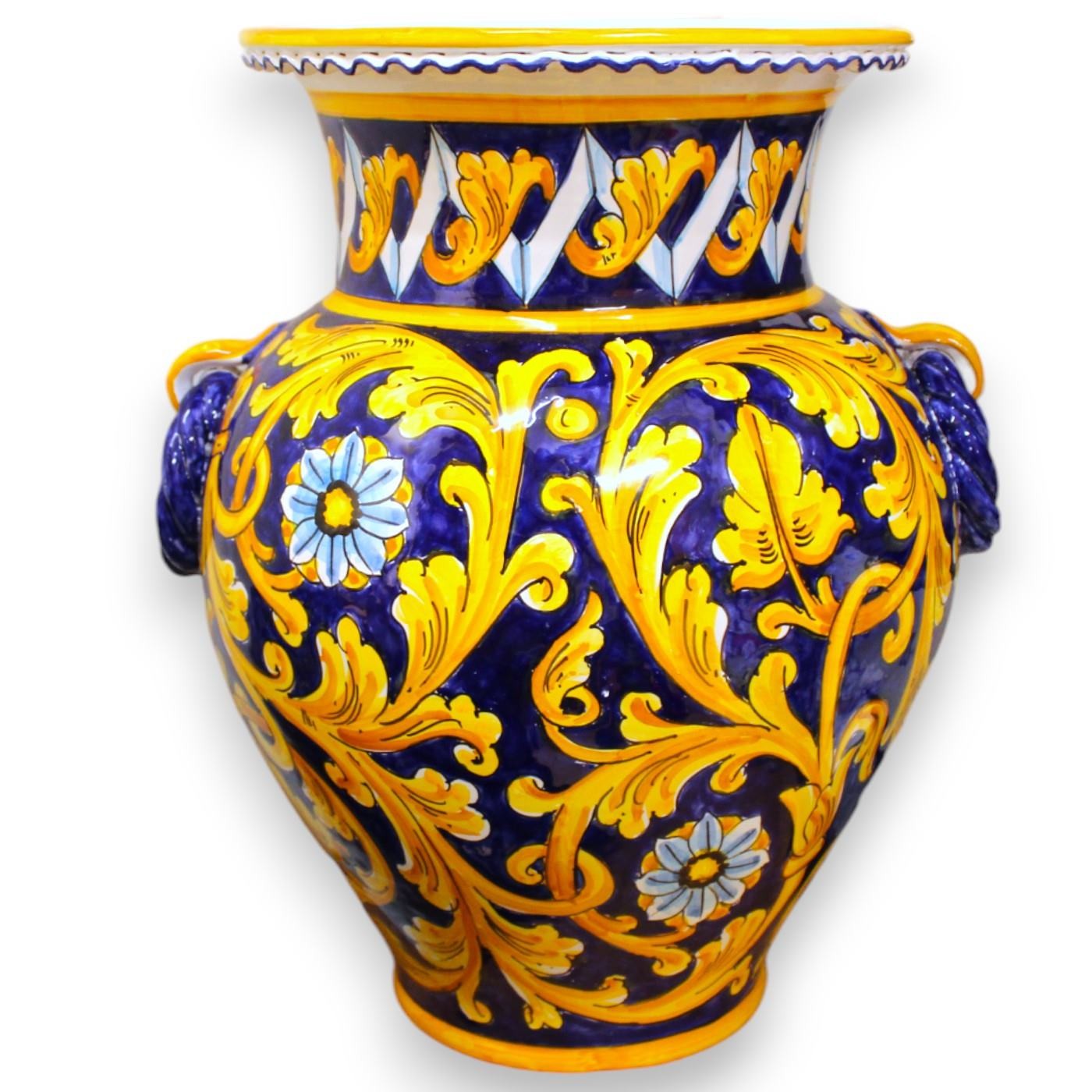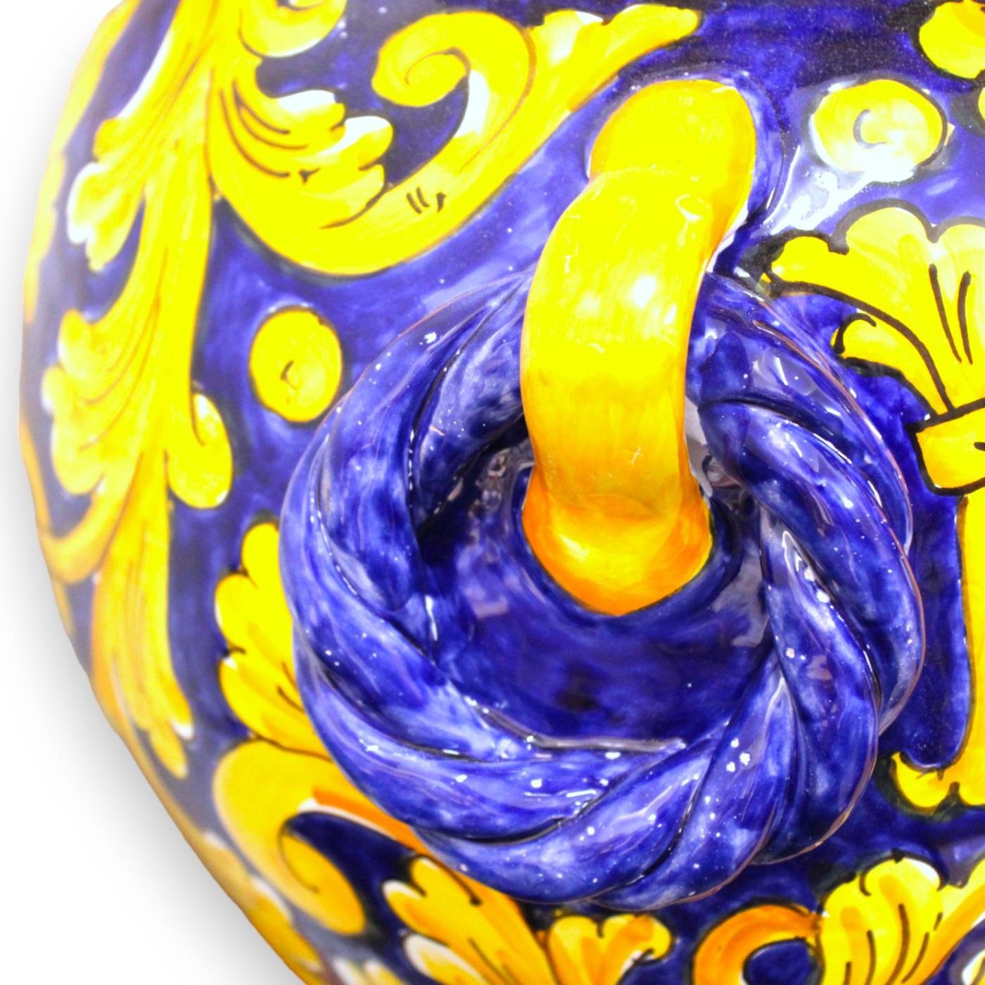 Espléndido tarro paraguas con asas Torchon, de fina cerámica siciliana, realizado al torno por nuestros maestros artesanos y meticulosamente decorado a mano.