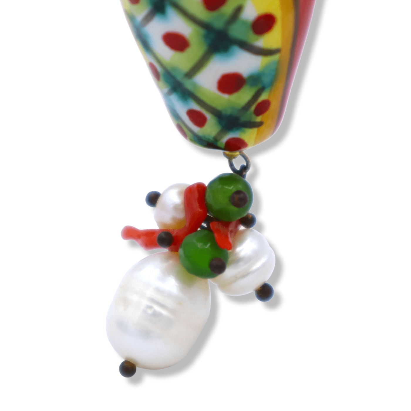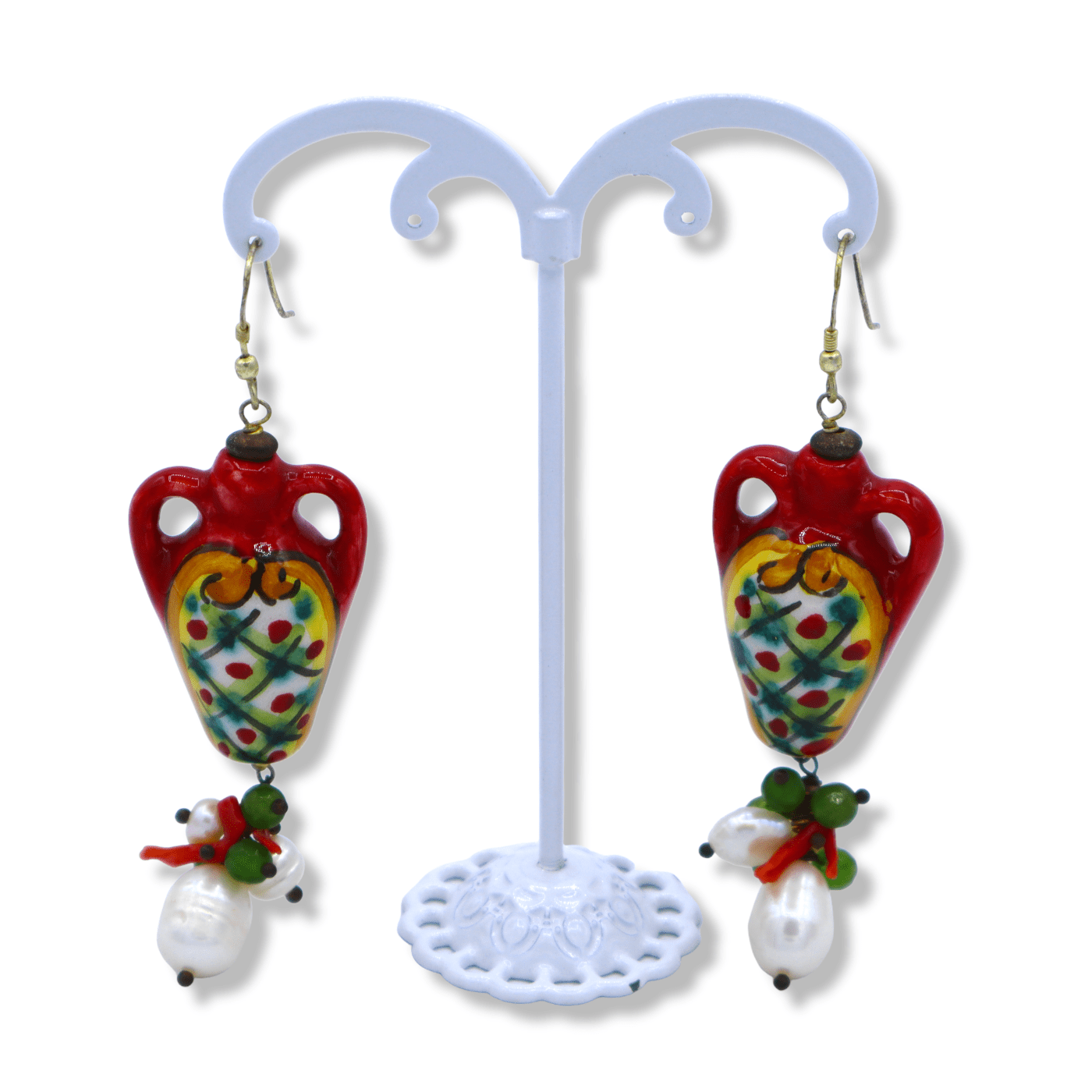 Splendide paire de boucles d'oreilles en céramique sicilienne, en forme d'amphore sicilienne avec perle Scaramazza, corail bambou et pierre de lave.
