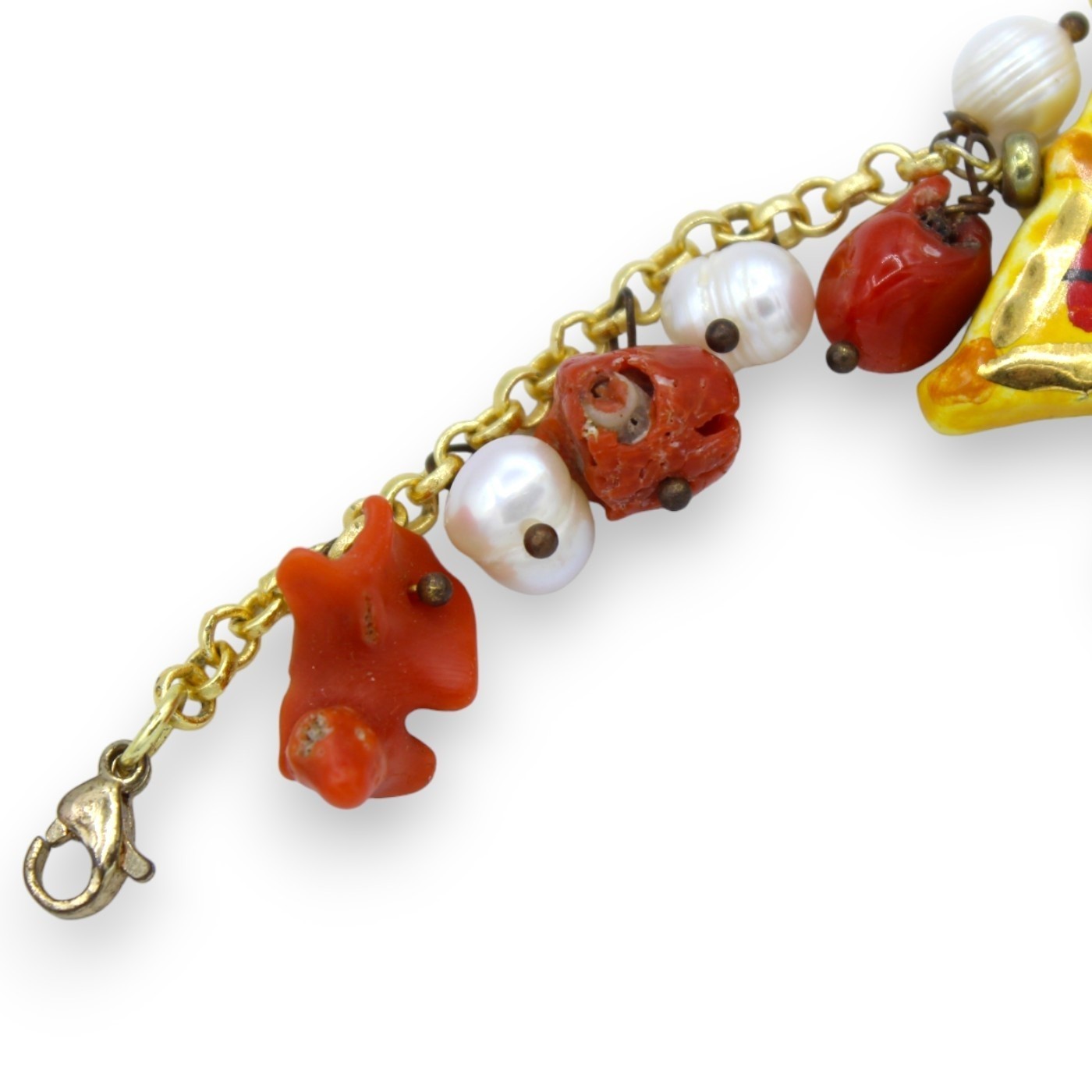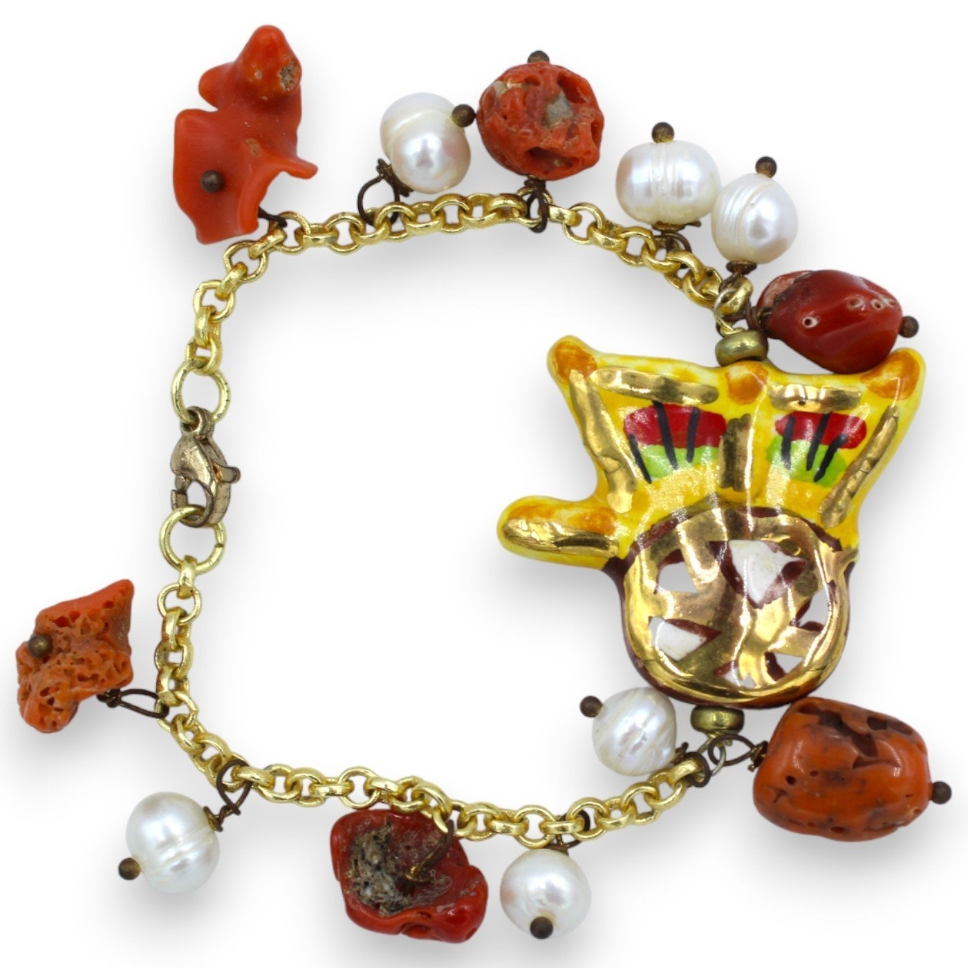 Splendide bracelet chaîne avec perles et coraux de bambou et charrette sicilienne en céramique fine de Caltagirone avec finition émail or pur