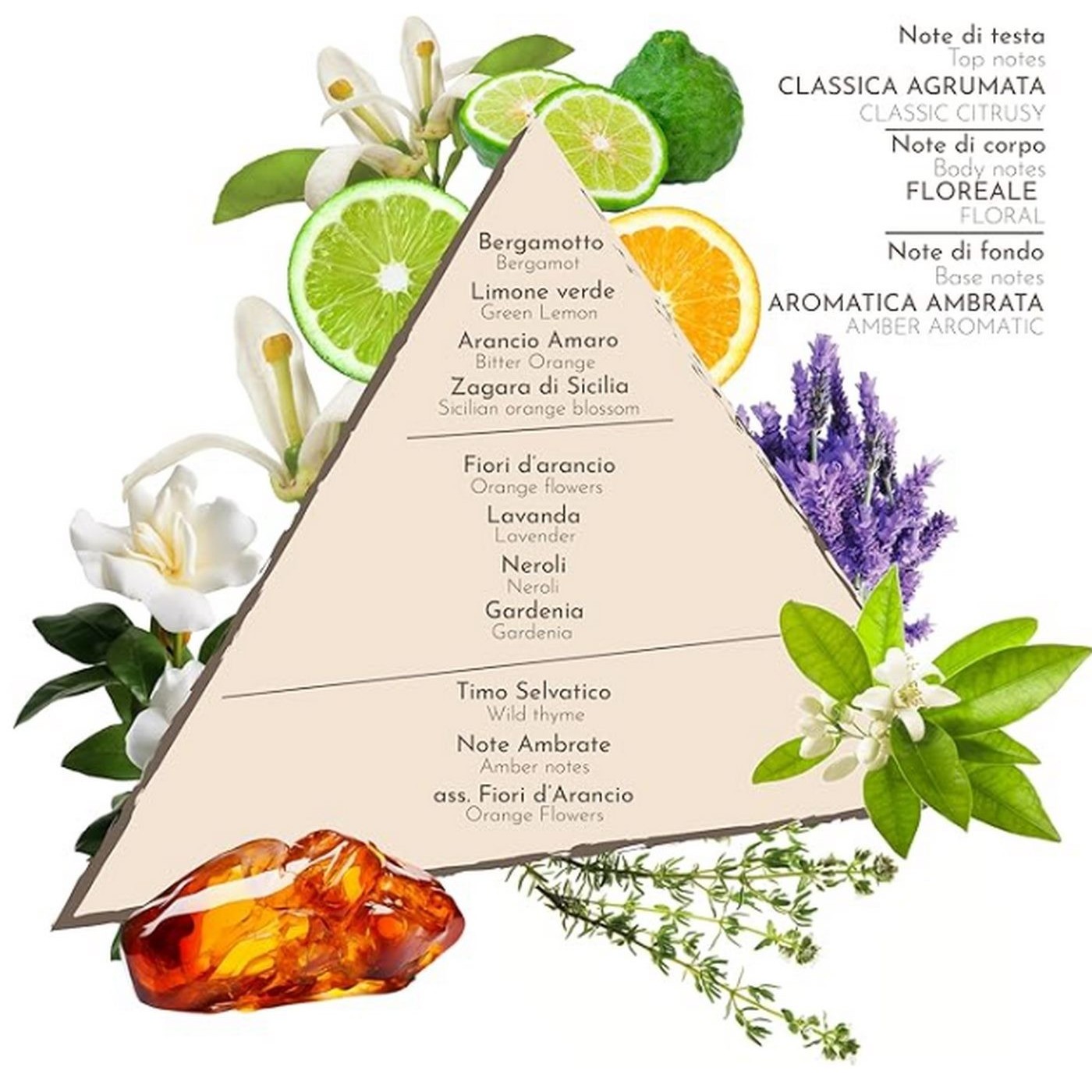 Le néroli, l'huile essentielle d'orange amère, confère à ce parfum une persistance d'agrumes particulière et piquante ; les notes de fond ambrées enrichissent l'ensemble de nuances veloutées et son parfum enivre et enivre, suscitant des émotions fortes et inexplicables.