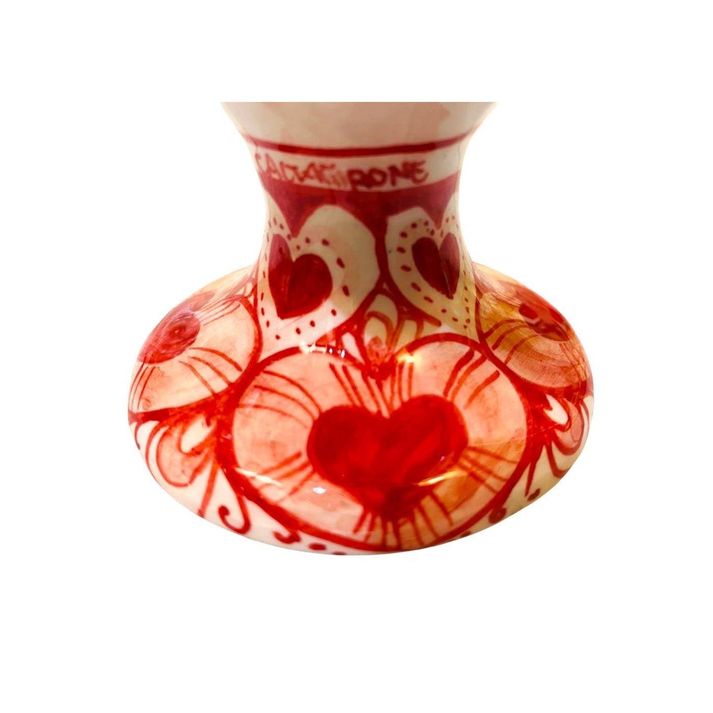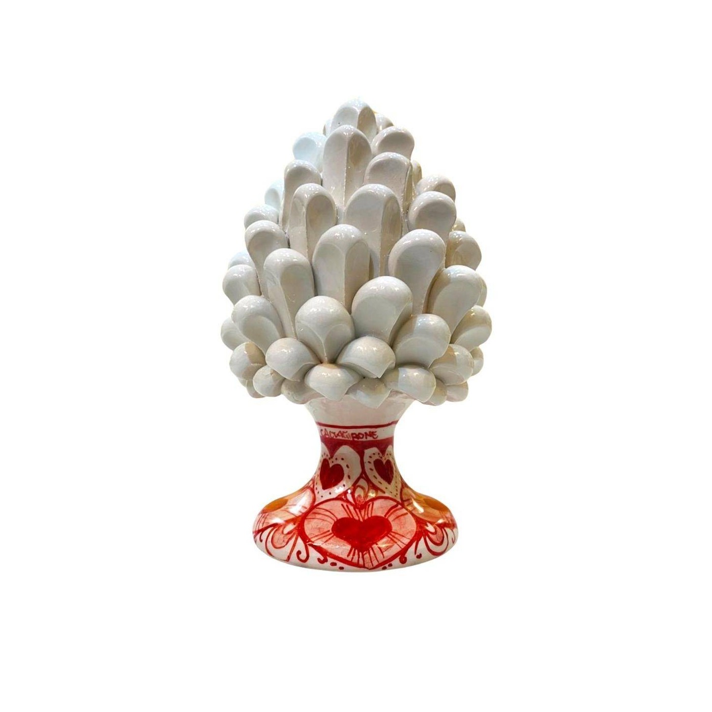 Pomme de pin sicilienne en céramique fine de Caltagirone, hauteur 16 cm avec base à décor de Coeurs.