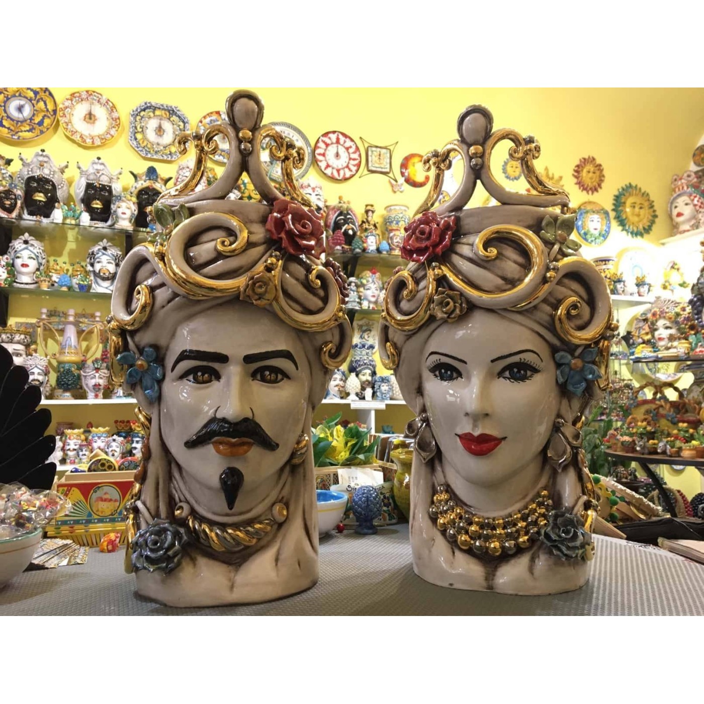 Paire de têtes marron foncé avec couronne en céramique fine de Caltagirone. Riche en applications de fleurs, d'émail d'or pur, de platine et de nacre