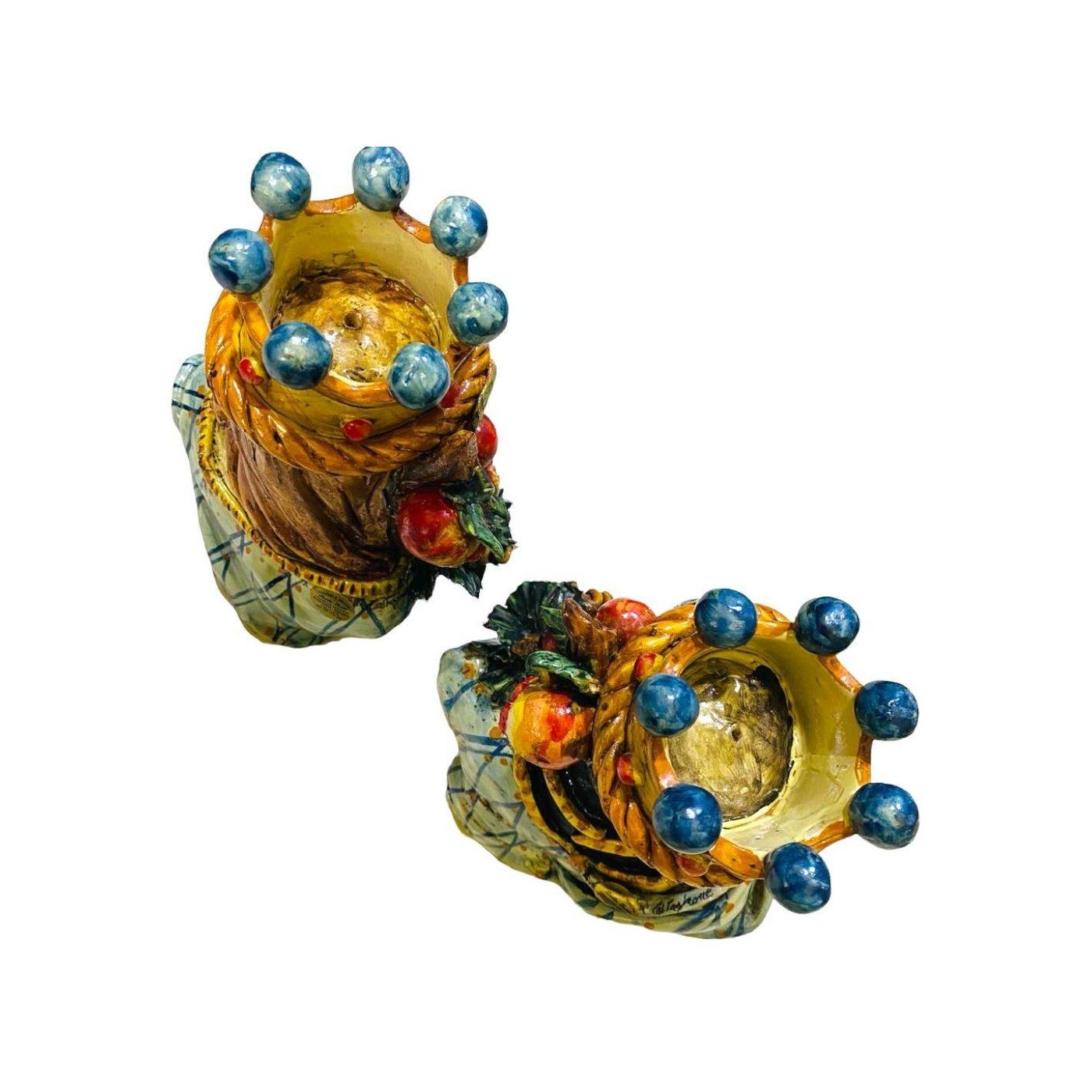 Pair of busts in precious Caltagirone ceramic with crown, grapes and pomegranates, symbol of abundance and prosperity, antique opaque enamel. Entirely shaped and decorated by hand. Height about 26 cm. They were handcrafted by a master craftsman from Caltagirone who took care of every single detail to make them, as is clear from the photos, a truly unique piece of Caltagirone art.