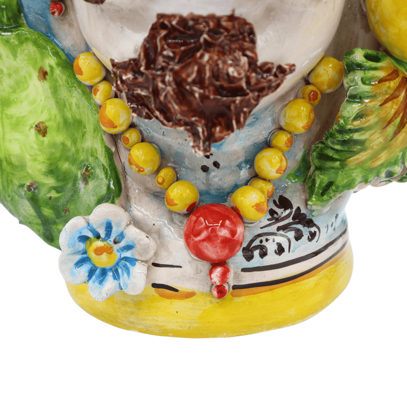 Pair of Sicilian Moorish Heads in fine Caltagirone ceramic, entirely hand-shaped and decorated. Model with prickly pear and fruit blades - Height 40 cm.