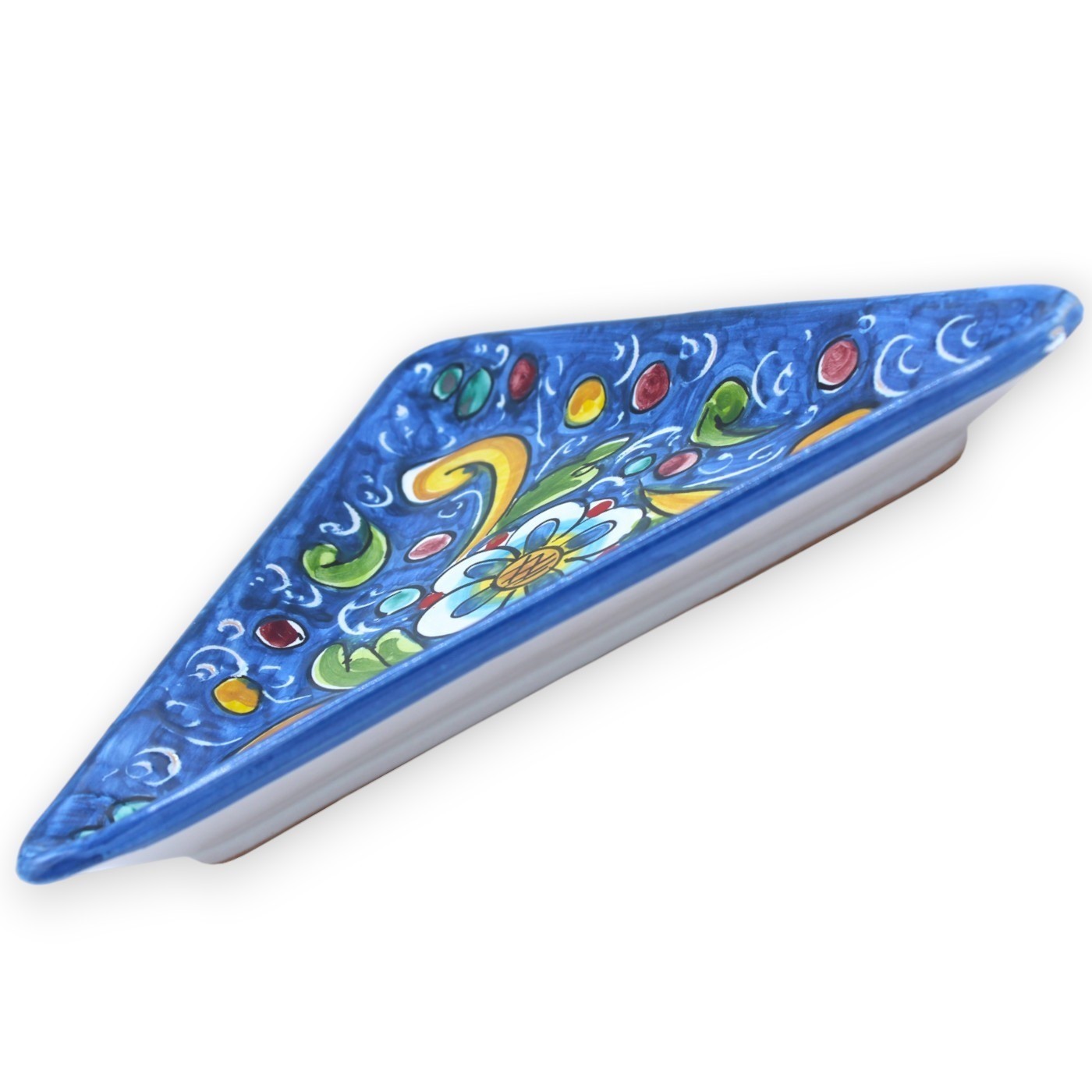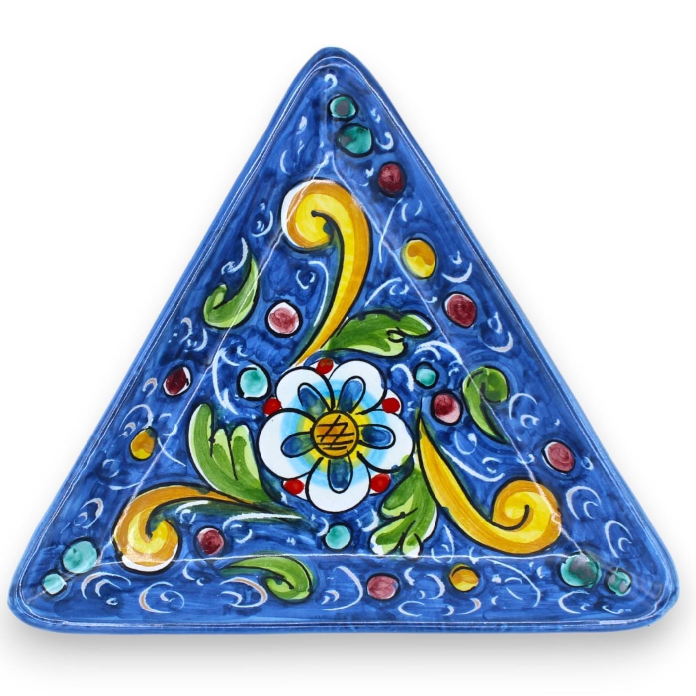 Vassoio Svuotatasche Triangolare, piatto da portata in ceramica di Caltagirone, realizzato e decorato minuziosamente a mano dai nostri maestri artigiani.