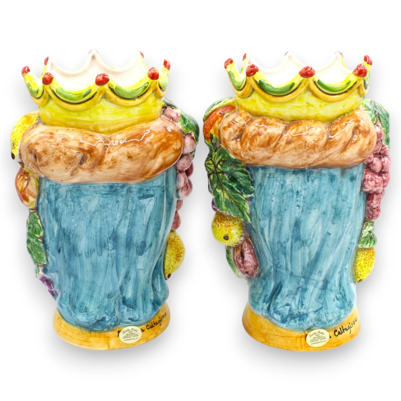 Coppia di Teste di Moro Siciliane in pregiata ceramica di Caltagirone interamente foggiate e decorate a mano.