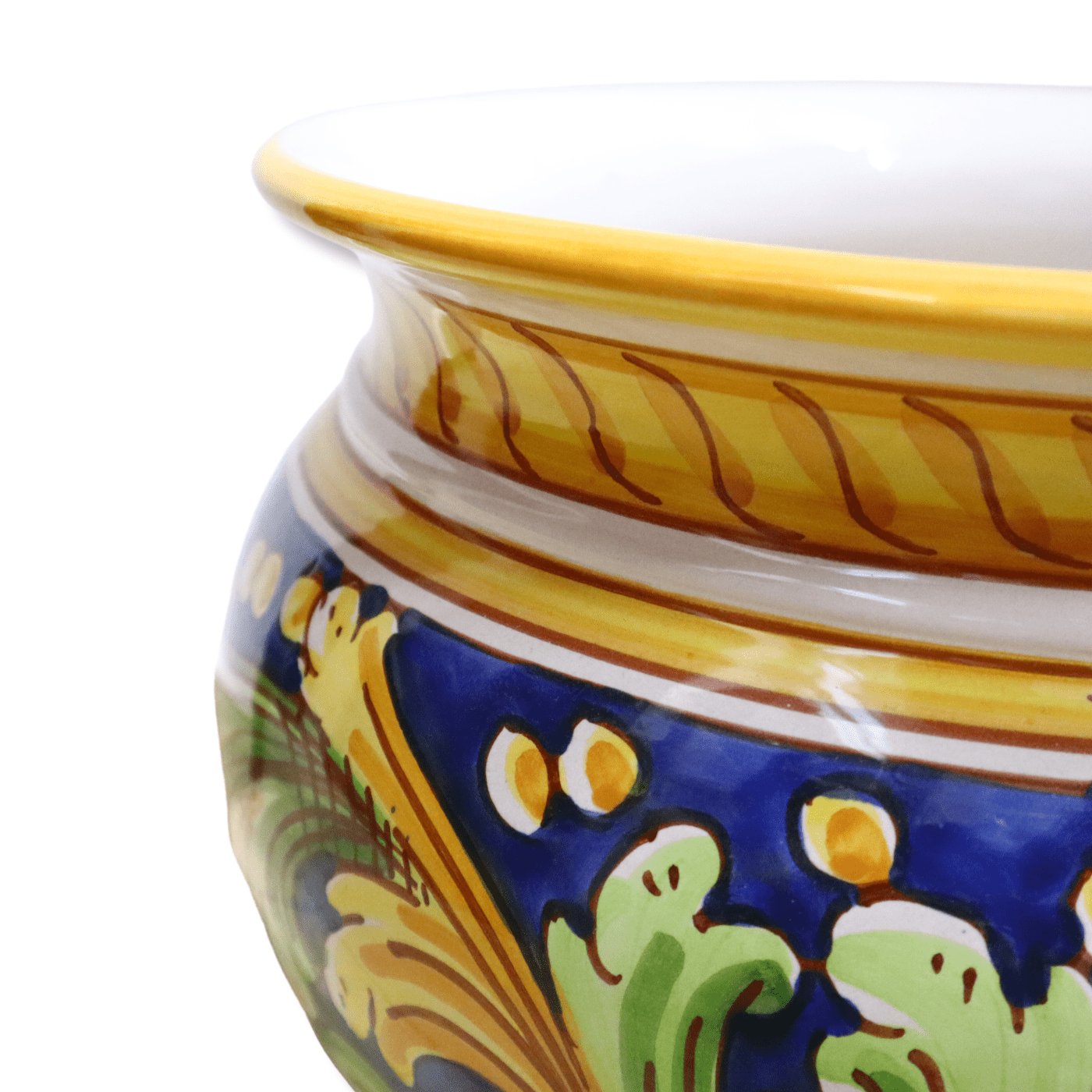 Splendido vaso Cachepot, vaso per piante in pregiata ceramica di Caltagirone, realizzato al tornio dai nostri maestri artigiani e decorato a mano minuziosamente.