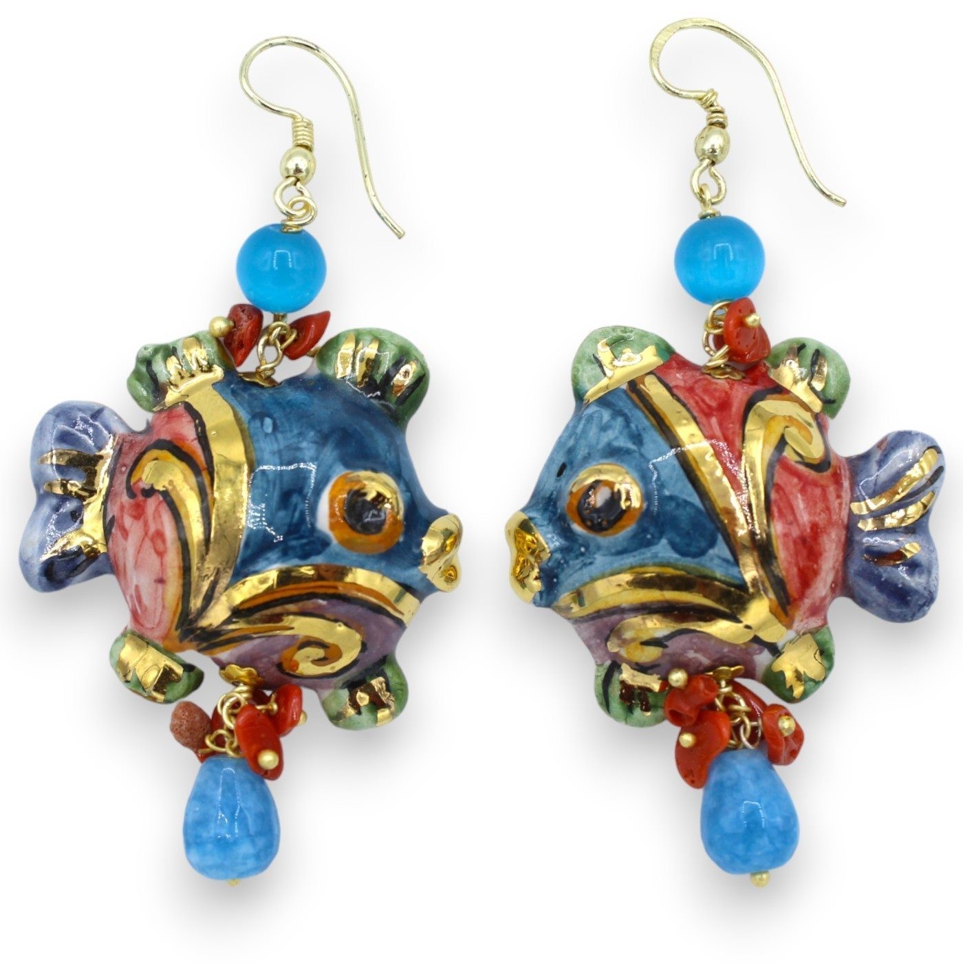 Prachtig paar hangende oorbellen in Caltagirone-keramiek, in de vorm van een kogelvis met bamboekoraal, engeliet en natuursteen.