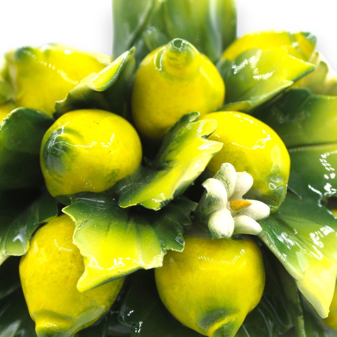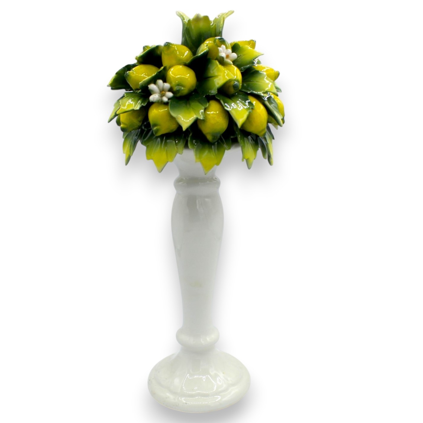 De kandelaar is versierd met een rijke compositie van realistische citroenen , een iconisch symbool van Sicilië, vergezeld van delicate oranjebloesems en fijn gemodelleerde bladeren. De elegante, slanke witte keramische voet vormt een harmonieus contrast met de levendige kleuren van de decoratie, waardoor het een waar designelement is.