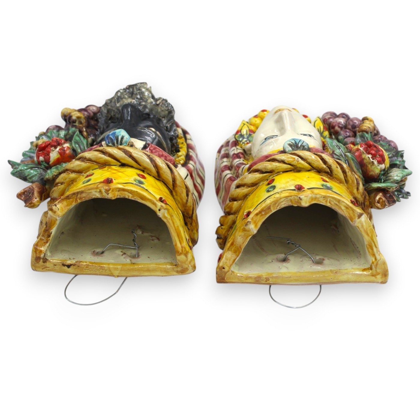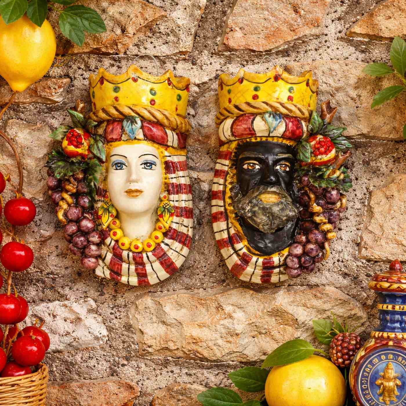 Deze verfijnde wanddecoratie toont het gezicht van een Moor of vrouw met een koninklijke kroon, versierd met granaatappels en druiven , eeuwenoude symbolen van voorspoed, vruchtbaarheid en overvloed in de Siciliaanse cultuur. Elk detail is met de hand en met ambachtelijke zorg geschilderd, waardoor elk stuk uniek en eenmalig is.