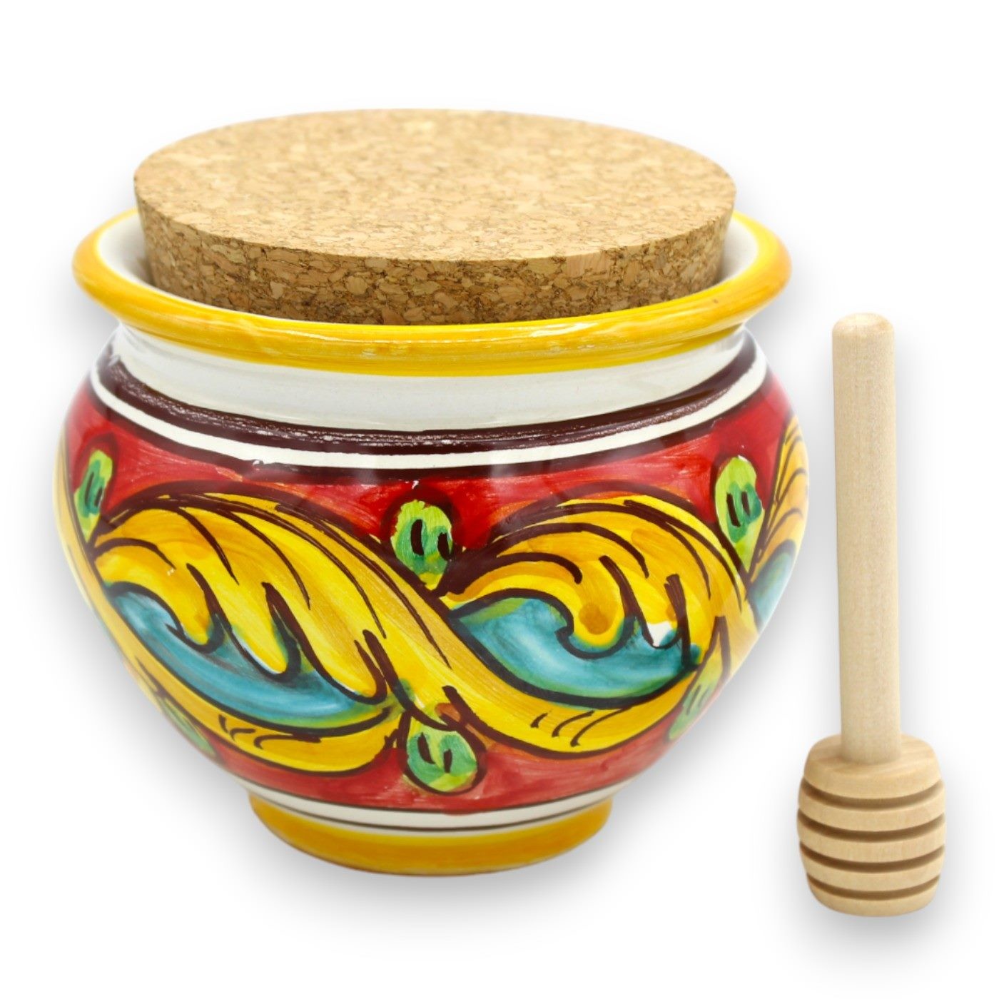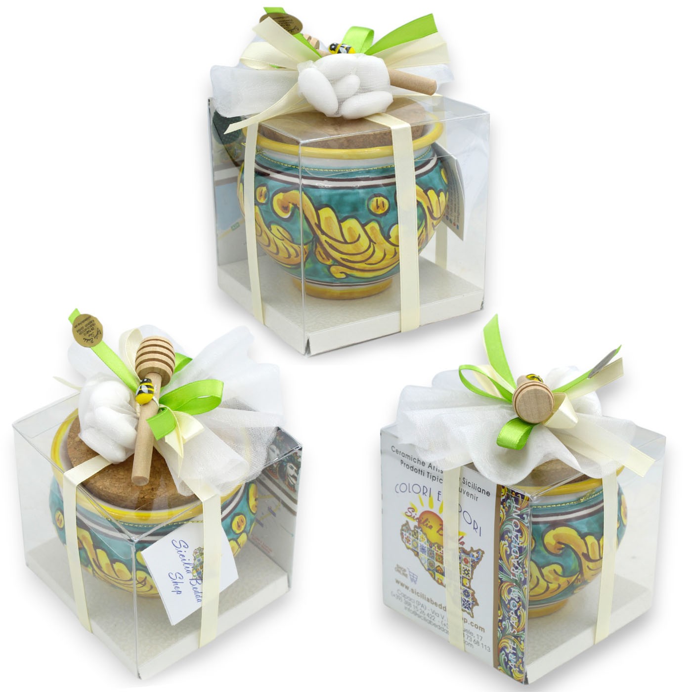 Prachtig huwelijksbedankje bestaande uit: Cachepot-vaas van fijn Caltagirone-keramiek, gevuld met 100 g Siciliaanse biologische honing. Feeënsluierzakje met 5 Maxtris dragees, smaken naar keuze tussen amandel of chocolade.