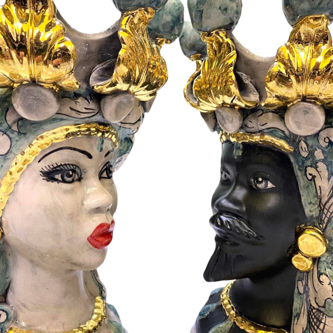 Imponentes e elegantes cabeças mouras com coroa em fina cerâmica Caltagirone, trabalhada com OURO na terceira queima