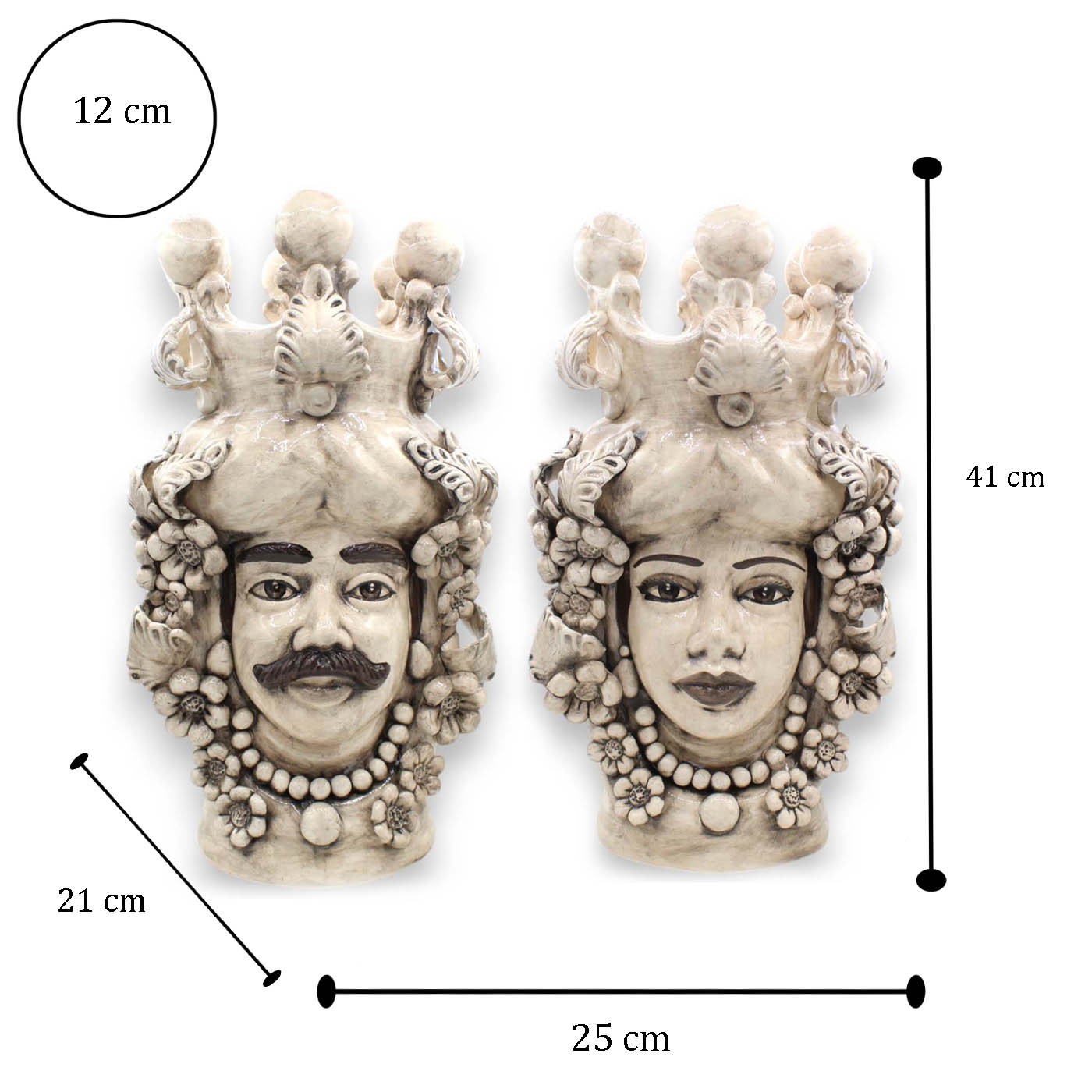Par de cabeças de mouro siciliano em cerâmica fina de Caltagirone, inteiramente moldadas e decoradas à mão.