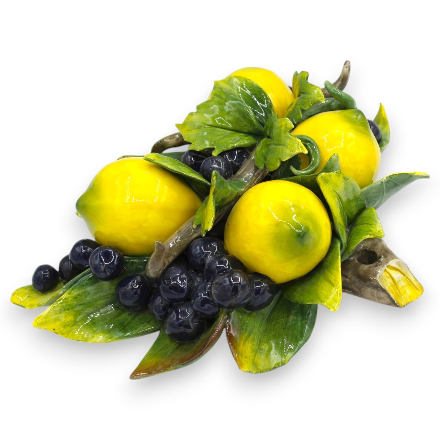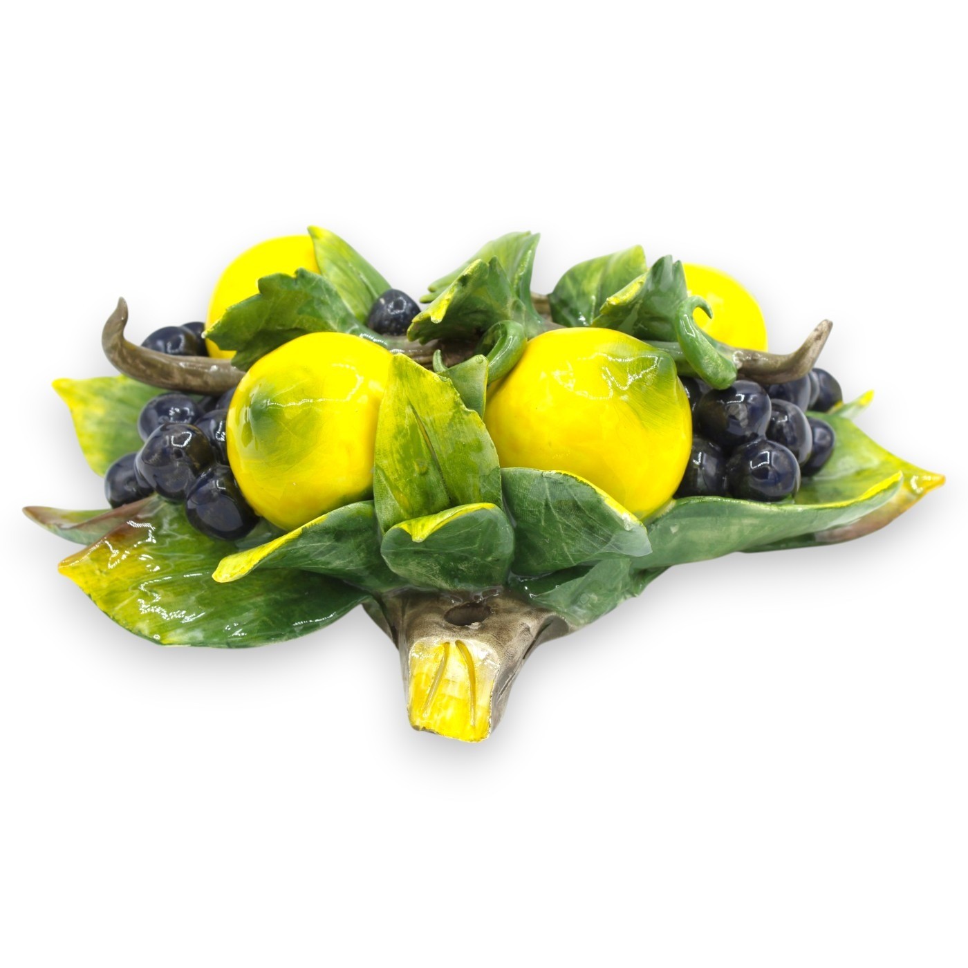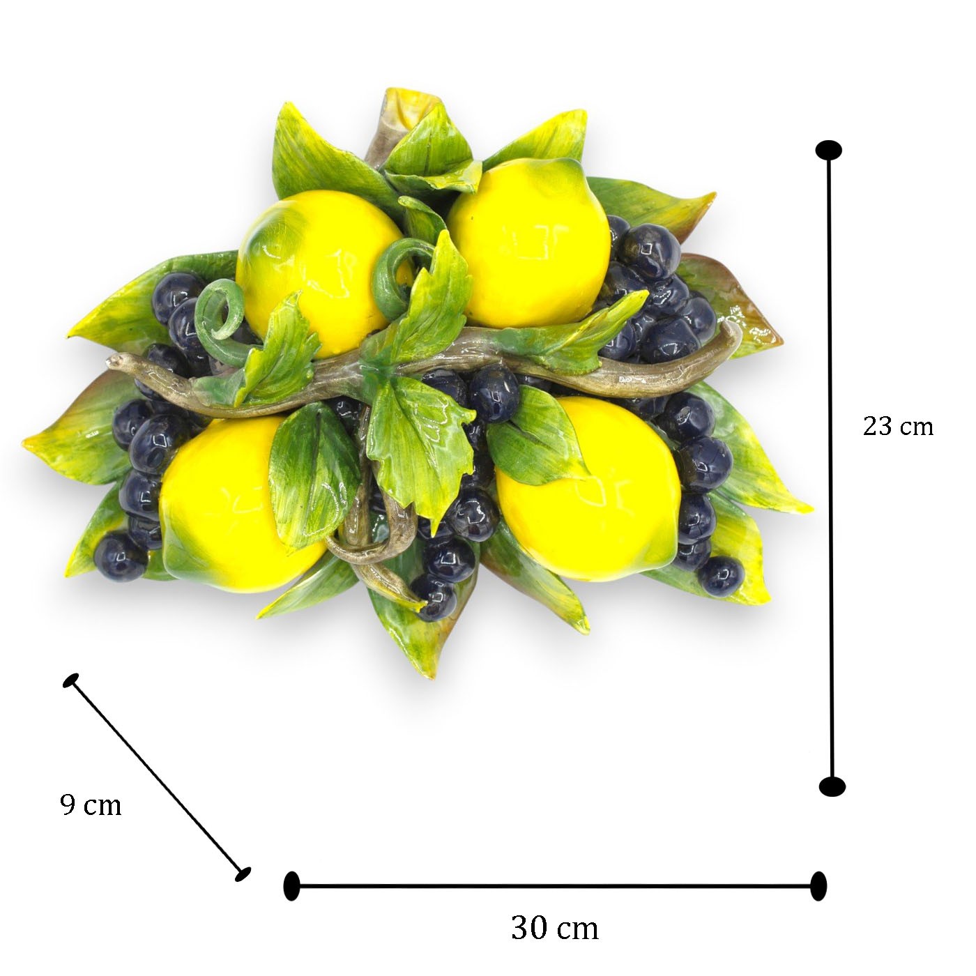 Traga o calor e as cores autênticas da tradição mediterrânea para sua casa com este deslumbrante conjunto decorativo de cerâmica , feito à mão por mestres artesãos. Uma composição elegante que combina limões vibrantes e cachos de uvas pretas , símbolos de abundância, prosperidade e beleza atemporal.