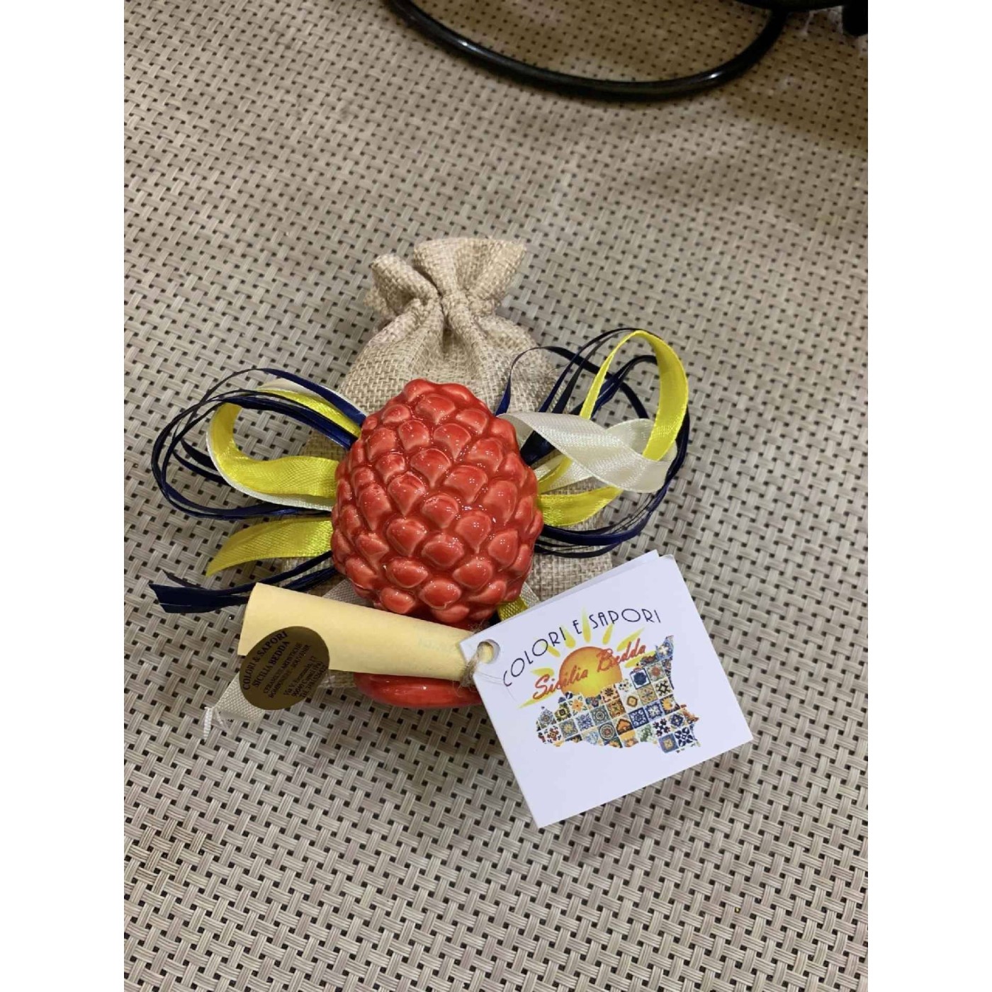 Lembrancinhas de casamento em forma de ímã de pinha siciliana, feitas de cerâmica, acompanhadas de um saquinho de juta e 5 amênd