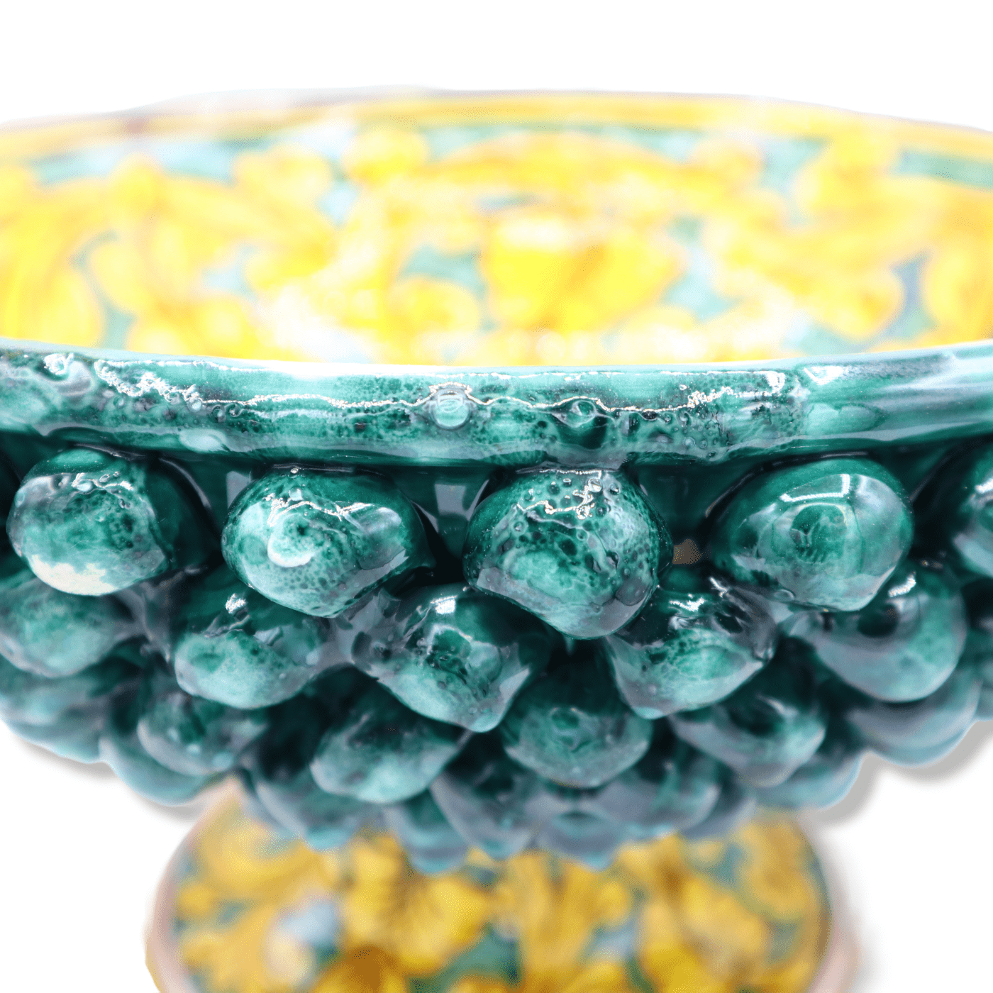 Esplêndido suporte Pigna em cerâmica Caltagirone na cor verdete com haste decorada em estilo barroco.