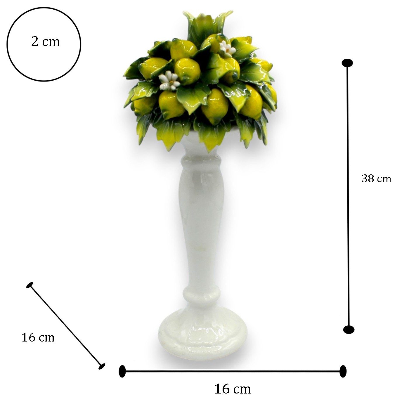 Ljusstaken är utsmyckad med en rik komposition av realistiska citroner , en ikonisk symbol för Sicilien, tillsammans med delikata apelsinblommor och fint modellerade blad. Den eleganta, smala vita keramiska basen skapar en harmonisk kontrast till dekorationens livfulla färger, vilket gör den till ett verkligt designelement.