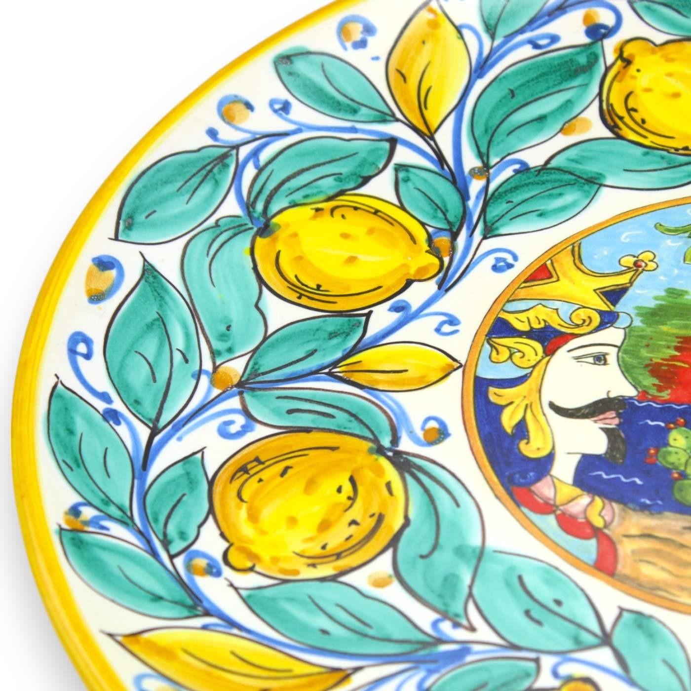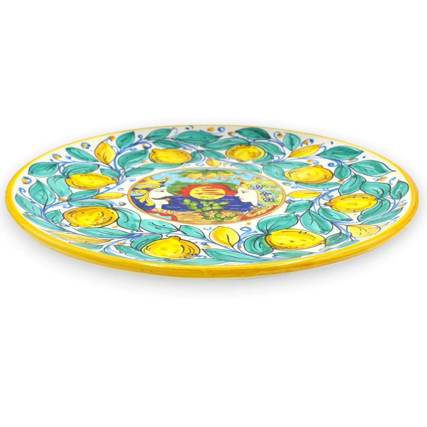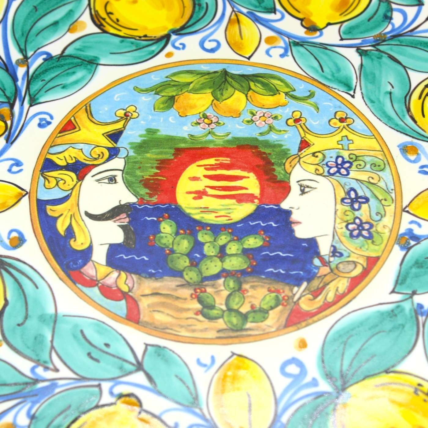 Stor och vacker prydnadstallrik i fin siciliansk keramik med dekoration av sicilianska citroner och morhuvuden